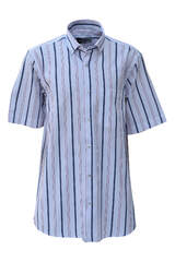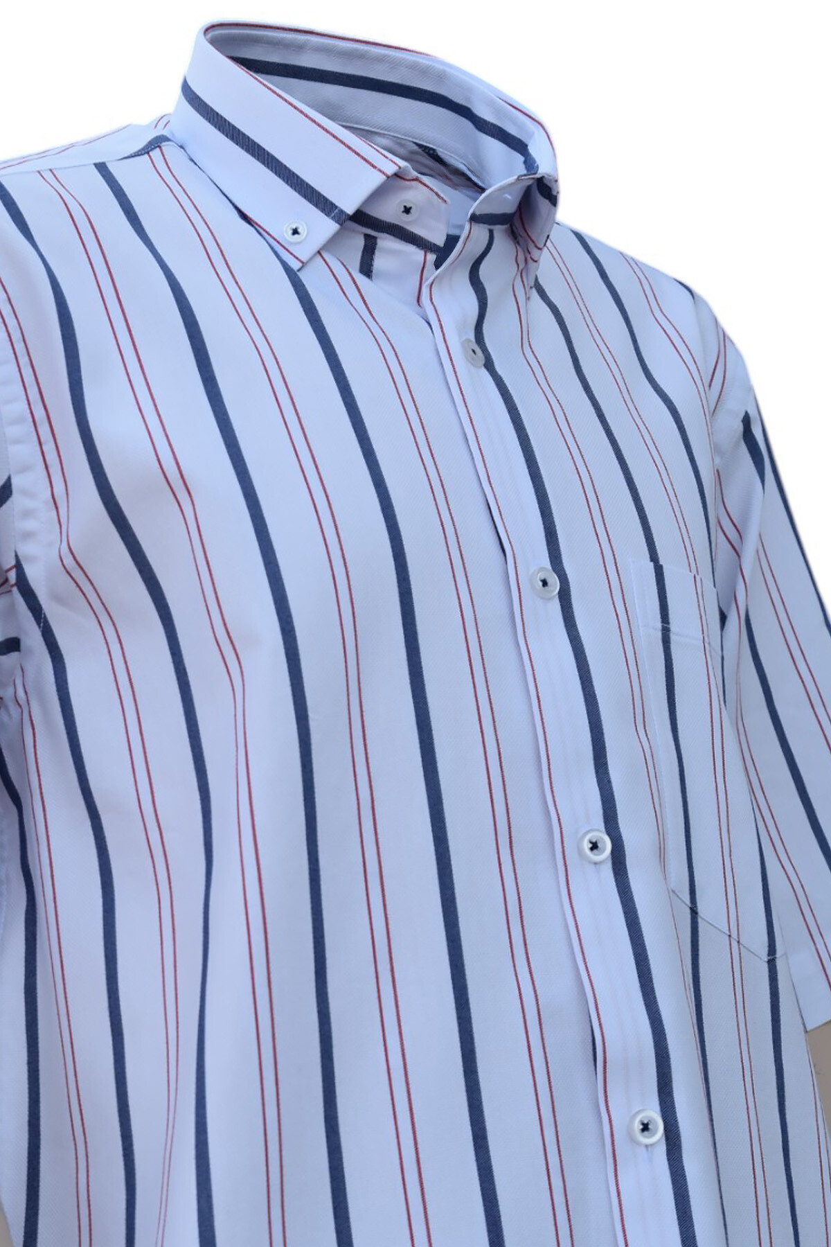 Beyaz Üzeri Kalın Lacivert ve İnce Kırmızı Çizgili Düğmeli Yaka Tek Cepli Klasik Kesim Pamuklu Kısa Kol Erkek Gömlek