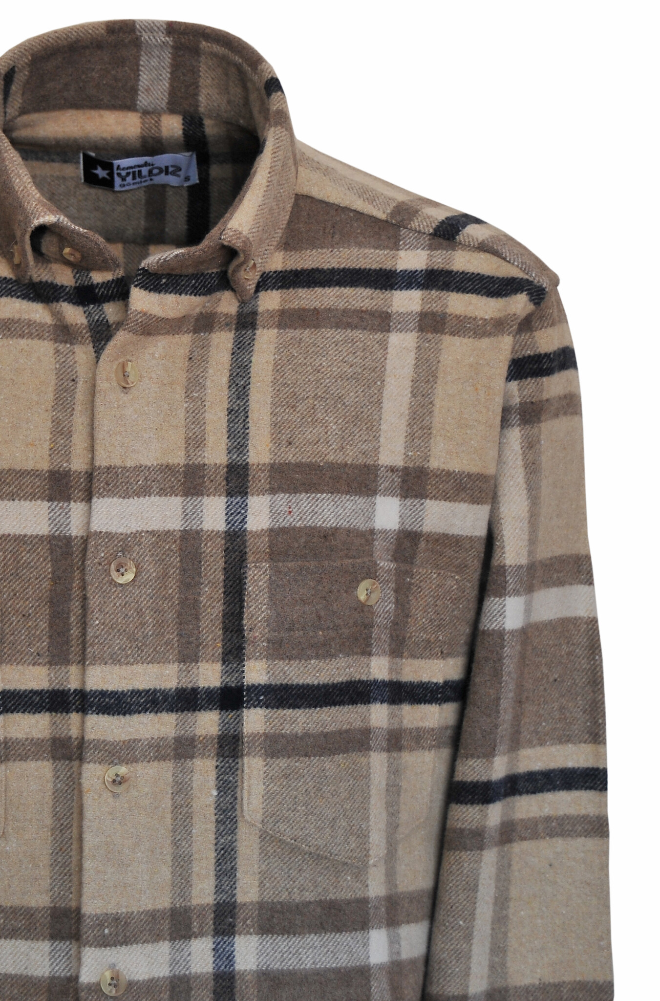 Cream-Brown-Black Plaid Pattern on Beige Ground Double Pocket Buttoned Collar Classic Cut Lumberjack Shirt