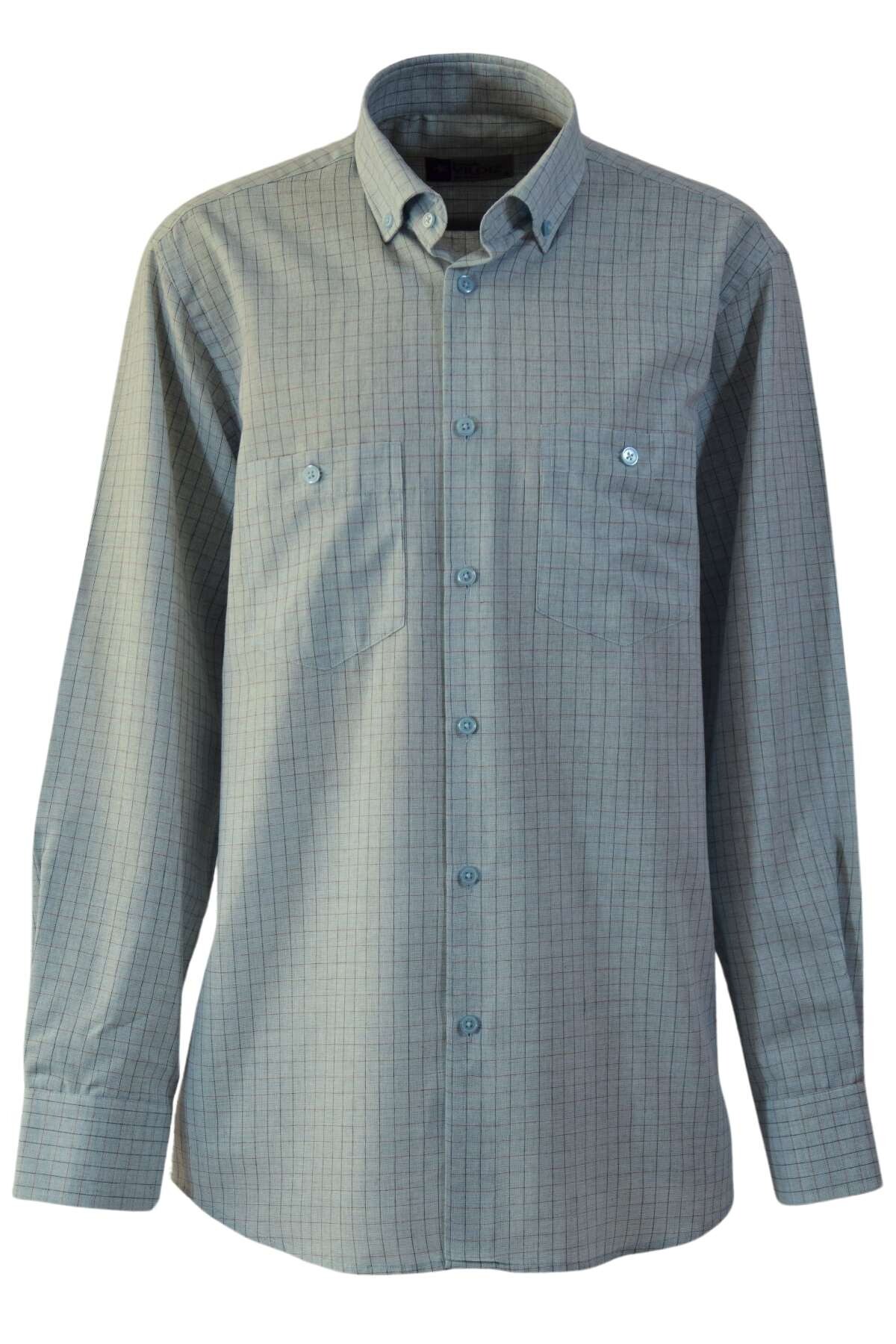 Mavi Üzerine Lacivert Kırmızı Kareli Keten Dokulu Çift Cepli Düğmeli Yaka Uzun Kollu Klasik Kesim Erkek Gömlek