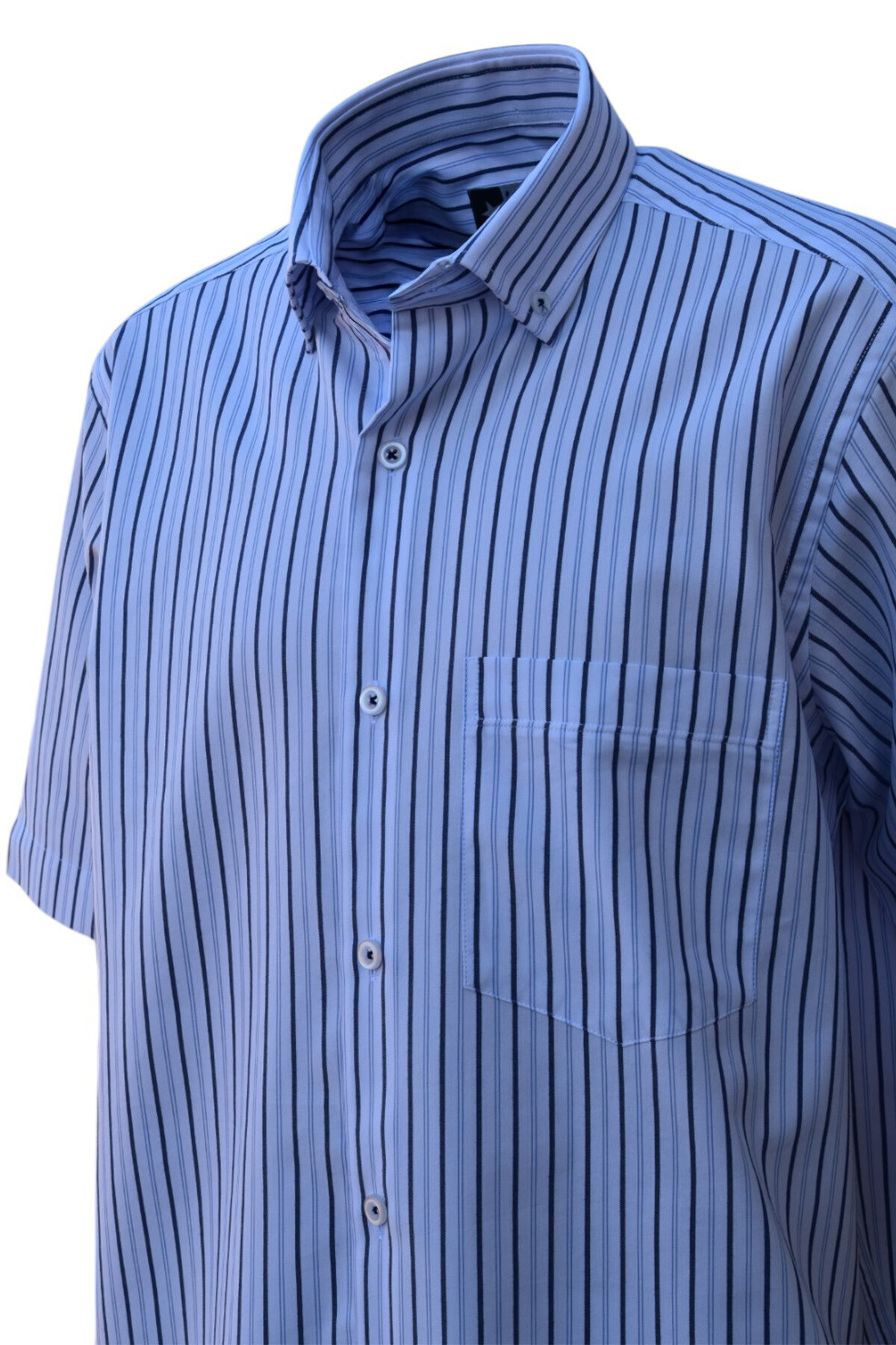 Beyaz Üzeri Lacivert Mavi Çizgili Düğmeli Yaka Tek Cepli Klasik Kesim Pamuklu Kısa Kol Erkek Gömlek