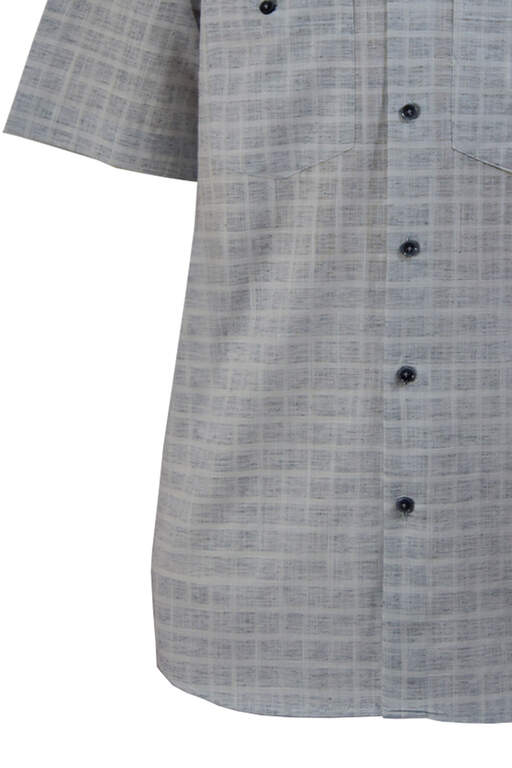 Krem Gri Kareli Keten Dokulu Çift Cepli Düğmeli Yaka Kısa Kollu Klasik Kesim Erkek Gömlek