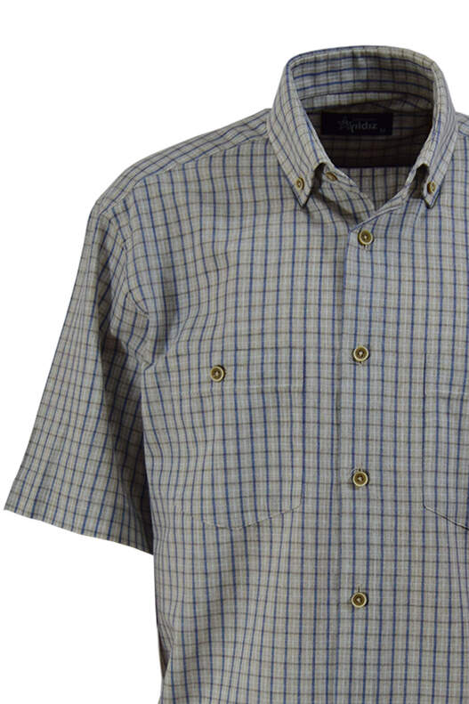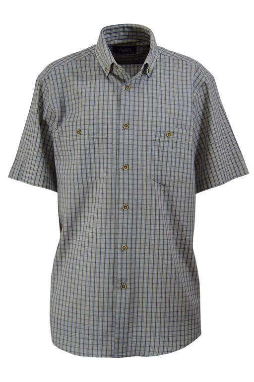 Haki Krem Mavi Kareli Keten Dokulu Çift Cepli Düğmeli Yaka Kısa Kollu Klasik Kesim Erkek Gömlek