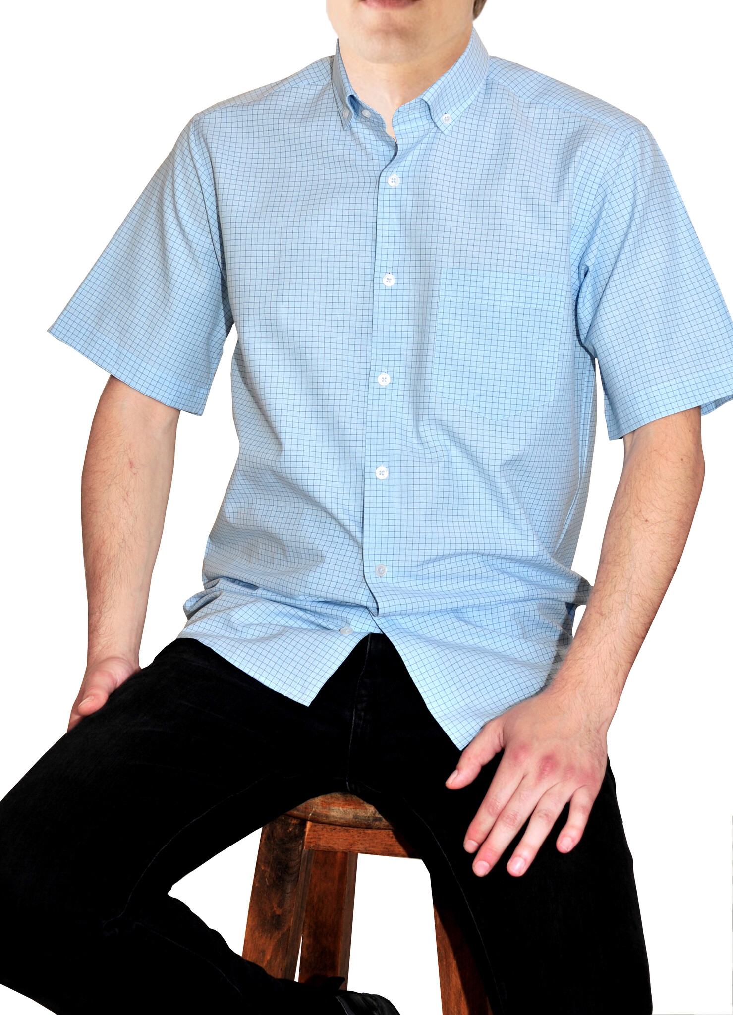 Black Checked Cotton One Pocket Buttoned Collar Short Sleeve Classic Fit Men's Shirt in Water Green