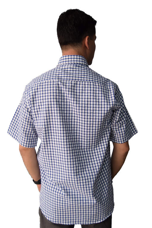 Navy Blue Grey Checked Buttoned Collar One Pocket Classic Cut Cotton Short Sleeve Men's Shirt on White Ground